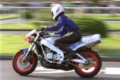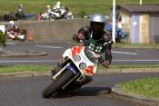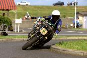 第2ヒートの出走を待つ畠山 茂選手(RGV250ガンマ)。Aクラスは他のクラスと違い第1ヒートはランキングの大きい順に出走します。そして第2ヒートは、他のクラスと同様第1ヒートのタイムの遅かった順番に出走します。畠山 茂選手は第2ヒートでは生タイムを2.5秒縮めるも、ペナルティ2秒加算がひびき、総合12位(1'35.613)、タイム比103.02%の結果に終わりました。