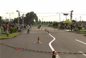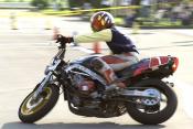 右の写真はスタート地点からコース中央を見たものです。畠山 茂選手がコース終盤の右回転セクションをクリア中です。手前の教習所中央の交差点に3カ所の2本のパイロンの間を通過しなければならないセクションが設けてあり、ここでの通過する順番が自由だったため、ライダーの話題になりました。順番は自由でも3角形の回りにはテープが仕切ってありラインの自由度はあまりなく、そしてここでの賭で涙を飲んだ選手もいました。