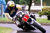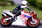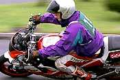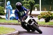 そして2ヒート目スタート!スタートしてすぐにヒート1より乗れているのが自分でもわかった。練習でコーススラロームしているのに限りなく近い感じで各セクションを抜けていった。回転も自分としてはまずまず。低速セクションからの立ち上がりだけはどうしようもなく遅いが、今回のコースはそこそこスピードが乗るターンも多く、気持ちよくRZを走らせる事が出来た。問題の狭路ターンはやはり難しかったがヒート1よりはマシな感じで抜ける。ゴールは近い。クランクの後、ストレートを抜け右回転。オフセットスラロームから立ち上がって最後の回転へ。いままで、決勝ヒートでマフラーを擦ったことなど一度もなかった。それだけマージンを大きくとって走っていた証拠なのだが、ここで始めてマフラーからすれる音が聞こえた。しかも半端じゃない。ああ、私の体重があと10kg軽かったら、このへたったリアサスにももう少し楽させてあげられるのだろうか。アクセルを開け、マフラーを擦る音は聞こえ続けた。リアサスはほとんど底着きし、タイヤが流れ始めた。次の左回転に備えてすぐにアクセルを戻さなければならないため、結果として軽いハイサイドですみ、ラインもそれほど乱れずに回転。ゴールめがけてまっしぐら。そのときわずかにマシンを右に振ったため、ジャックナイフでバランスを崩し、転倒。幸い車体はゴールエリア内からはみ出さなかったのでペナルティを受けなかったが、恥ずかしかったので、そそくさとその場を離れた。