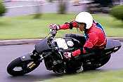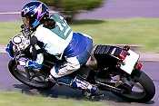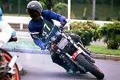 1ヒート目の反省から2ヒート目では早めにウォーミングアップ場前で待機。アナウンスを待つ。ウォームアップを始め、ゆっくりとペースを上げていく。いつの間にか背後にはヒート1でトップタイム(1'35.440)を出した佐藤氏が。3秒以上も離されていたので、ううむ負けられん、と言うよりは、なんとかヒート1のタイムに追いつきたいという思いでペースを上げた。午後は気温も上がり、Tシャツ1枚でも汗ばむぐらいになっており、タイヤのグリップ感もいい感じだった。ターンへの進入速度を徐々に上げ、自然とRZもバンク角が大きくなり、マフラーが路面を擦り始めた。程良くウォームアップを済ませ、オフィシャルに8の字区間へと誘導される。よし、いい感じだ!今度は心の準備もバッチリ。
