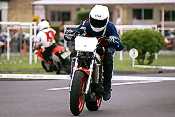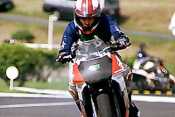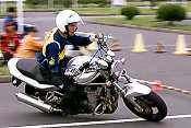 以前はノービスクラスは一番最初の出走だったのだが、主催者の配慮でC2クラスの後に走れることになり、シード選手の走りを事前にチェックできることになった。ジムカーナは出走前のコースのイメージが頭の中に入っていないとタイムは出ない。慣熟歩行が何度も出来るとはいえ、たった2回の走行で自分の力を出し切るためには出走前のイメージ作りがかなり重要である。そのためにも他の人が走っているのを事前に見れるのと見れないのでは、そのイメージ作りが違ってくる。ノービスクラスにとっては自分たちより速いライダーの走りを事前にチェックできるのはほんとにありがたいのである。ただ、私はあまりにもゆっくりと写真撮影と走りのチェックをしていたため、ウォーミングアップに出るのが遅れてしまい、あれよあれよという間にスタート地点に誘導され、心の準備が出来ないまま私の番が来てしまった。