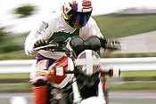 今回、仕事の疲れが抜けきれず、また前日も寝るのが遅くなり、ろくに大会の準備もせずに当日を迎えた。やる気がなかったわけではもちろんないが、朝6時半にようやく目を覚まし、準備も満足に出来なかった。雨に備えて400を5本、100は7本持っていく。カメラはバックごと持っていく気がしなかったので他の荷物と一緒にαにトキナーのニューレンズをつけて、そのまま放り込む。これまではX-700に50mm,135mm,200mmの3本のレンズ、もしくはジャンクのズームレンズで撮影に望んでいたのだが、やはりズームレンズはいい。特に80-200クラスの望遠ズーム。ほんとにこれ1本で事足りる。特にこのトキナーの大口径ズームは、なかなかどおしていい性能だ。ファインダーの見栄えからして違う。ただAFの性能は使えないレベルだ。まあ、もともとミノルタAFの性能は期待していなかったが、スポーツの動きにはまったくついていけない。スポーツでAFを使いたければやはりEOS1nかF5しかありませんな。もちろんそんな金はないので、割り切ってマニュアルフォーカスで使えばまったく問題ないのだが。撮影ポジションとしては確かにこのクラスのズームが最適なのだが、場所が場所なのでバックの処理に苦労する。絵になる場所が非常に少ない。観戦ポイントが即撮影ポイントには絶対ならないのも難しいところ。決勝コースは同じ人はたった2回しか通らないし、失敗する可能性が高い。それ故にウォーミングアップ場でいいポイントを探すことになるのだが、それでもバックの処理に困ることがあるので、やはり300mmF2.8のレンズが欲しいところだ。私のRZと同じぐらいの値段なのが玉に瑕ではあるが。
