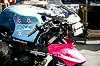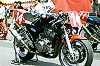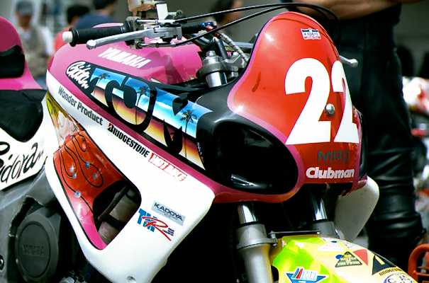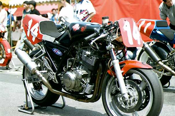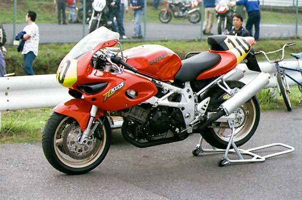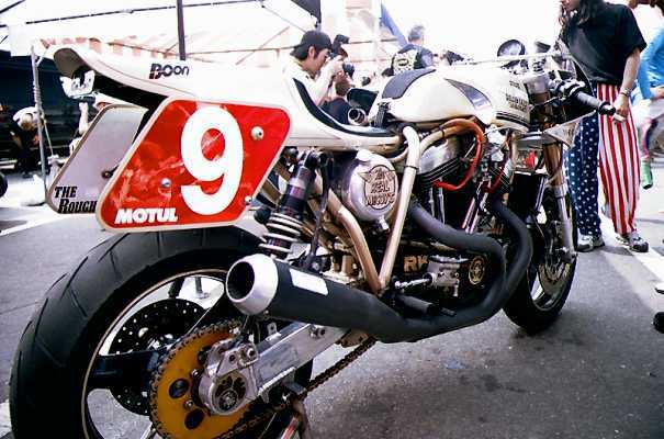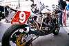 左はTT−1(タイムトンネル)クラスのH-D XR-TT。大浦聡の乗るチームイワキK'Sガレージのマシン。とにかく仕上がりが美しいです。その右は新興勢力のひとつ、スズキのTL1000S。これはMT(モディファイド・ツイン)クラスのマシンで、ほとんどノーマルの状態のように見えます。 真ん中は塗装の綺麗なET(エキスパート・ツイン)クラスTDM850。外観もかなり異質な感じです。