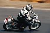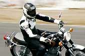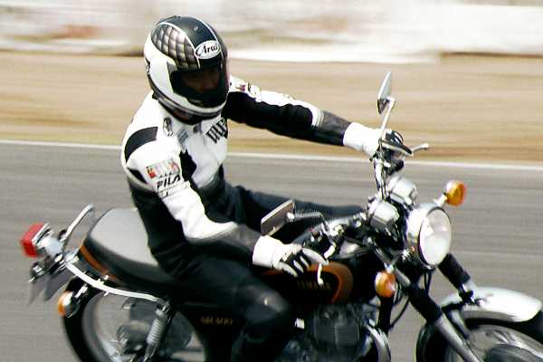 シャッタースピードを遅くしてスピード感を出そうと思ったのですが、ブレブレの不鮮明な写真になってしまいました。ツナギは相変わらずシブイ(ちょっと地味)ですね(^^)。